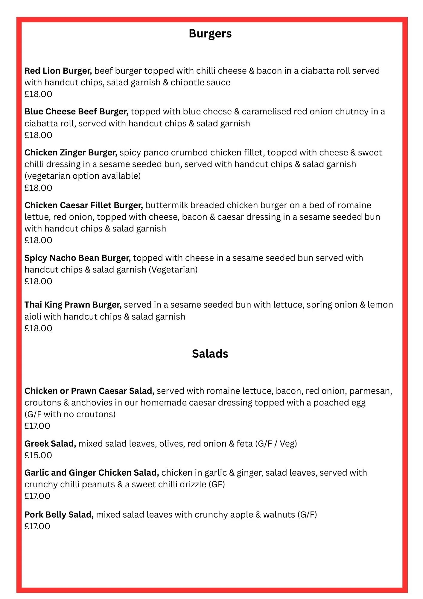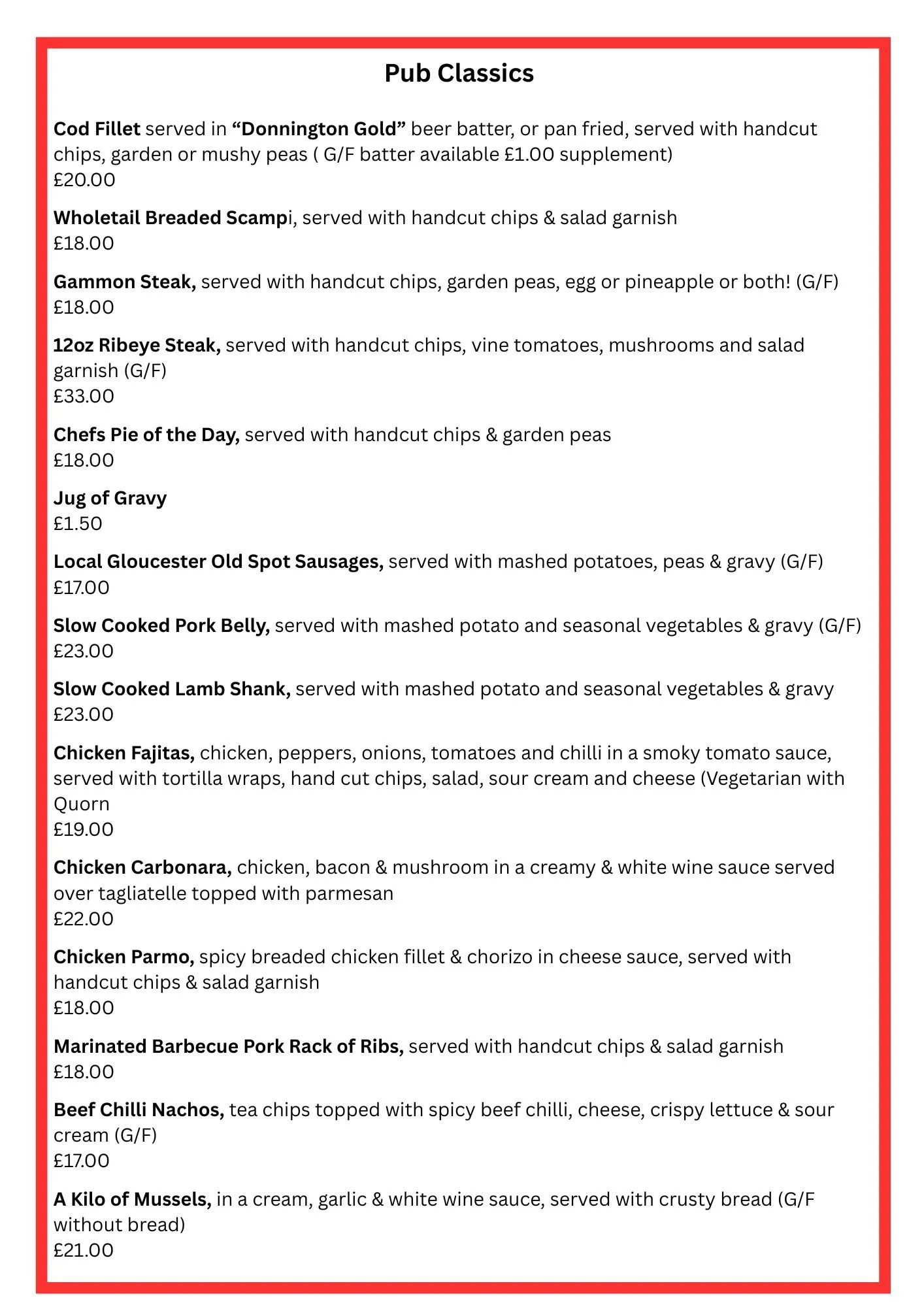 Sunday Lunch Menu